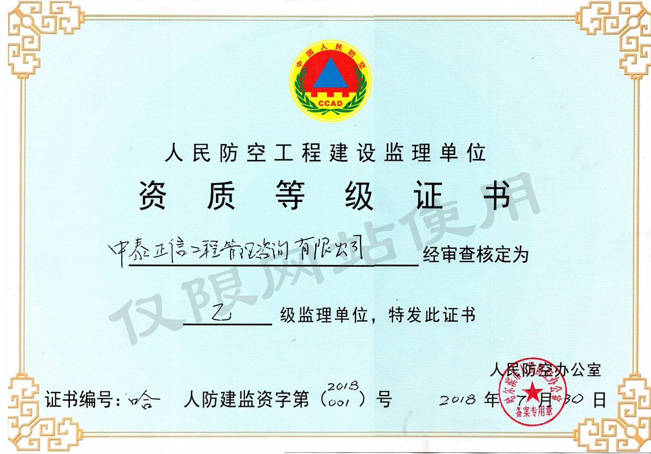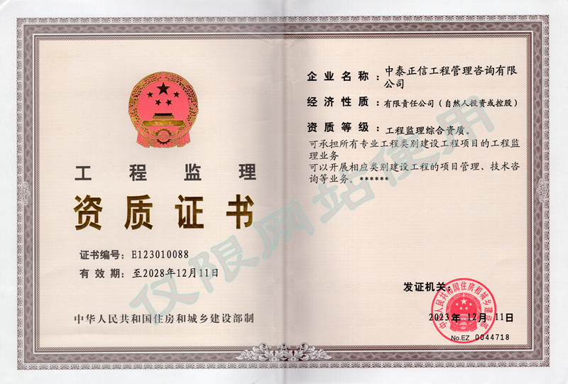 公司具有住建部核發的工程監理綜合資質,同時具有:造價咨詢甲級、文物保護監理乙級、人防工程監理乙級、設備監理乙級、招標代理資格、投資咨詢資格、軍工項目涉密資質、水利工程監理資質、地質災害治理監理、地質災害治理勘查、地質災害治理設計、地質災害治理危險性評估等資質。具備開展大型工程項目全過程咨詢能力,并大力推進行業轉型升級。