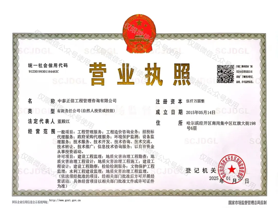 中泰正信工程管理咨詢有限公司(原黑龍江正信建設工程監理有限公司,成立于1993年,由黑龍江省工程質量監督總站和老干部實業公司發起創辦),注冊資本5000萬元。